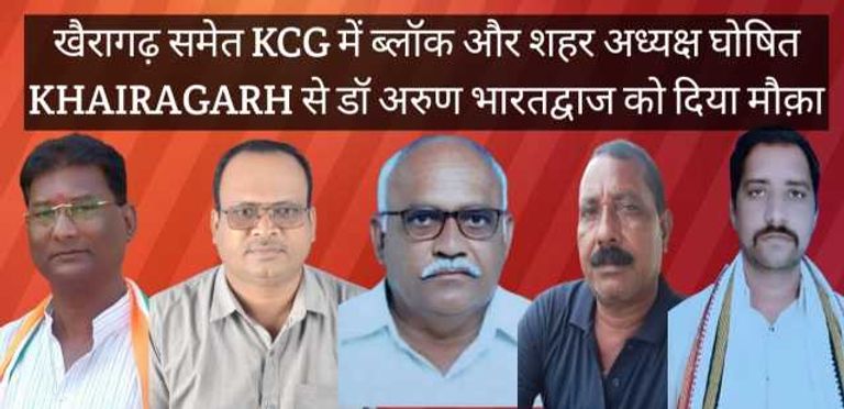 जारी आदेश के अनुसार खैरागढ़ शहर कांग्रेस कमेटी की कमान डॉ. अरुण भारतद्वाज को सौंपी गई है। वहीं खैरागढ़ ब्लॉक कांग्रेस कमेटी (ग्रामीण) का अध्यक्ष संदीप सिरमौर को बनाया गया है। इसके अलावा छुईखदान ब्लॉक कांग्रेस कमेटी के अध्यक्ष रामकुमार पटेल,गंडई ब्लॉक कांग्रेस कमेटी के अध्यक्ष शत्रुघ्न चंदेल तथा मुढ़ीपार ब्लॉक कांग्रेस कमेटी के अध्यक्ष तेजराम वर्मा को नियुक्त किया गया है।