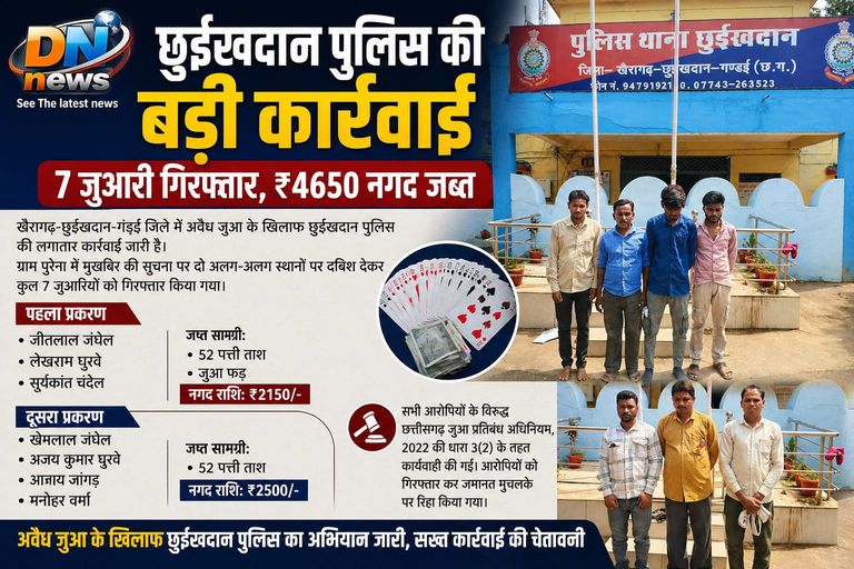 खैरागढ़-छुईखदान-गंडई जिले में अवैध गतिविधियों के खिलाफ पुलिस की सख्त कार्रवाई जारी है। इसी क्रम में थाना छुईखदान पुलिस ने ग्राम पुरेना में जुआ खेल रहे लोगों पर दबिश देकर दो अलग-अलग प्रकरणों में कुल 7 आरोपियों के खिलाफ कार्रवाई की है। पुलिस ने मौके से कुल ₹4650 नगद, 52 पत्ती ताश और जुआ फड़ जब्त किया है।